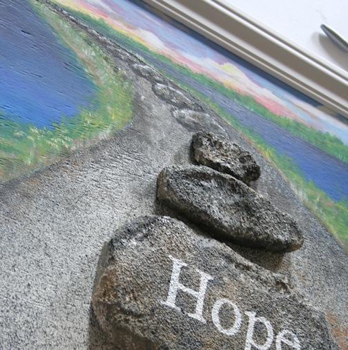 Then, using a template of printed words that I typed up using some key words chosen by a CCC project leader, I painted the words onto the stones in white. "Hope–Healing–Community." I traced over the words on top of a layer of transfer chalk, pushing down to get a template transferred onto the styrofoam, which also embossed it a bit.